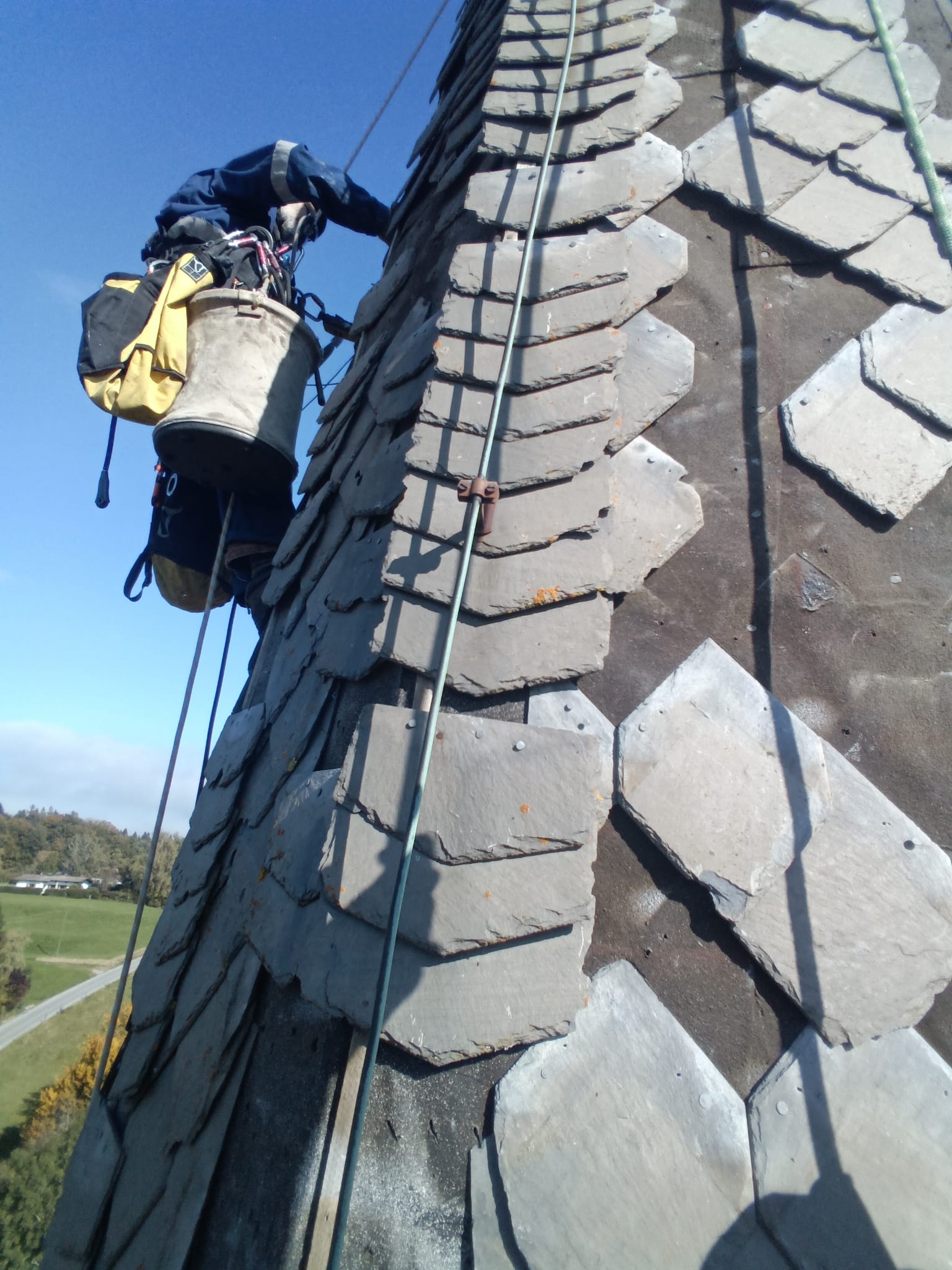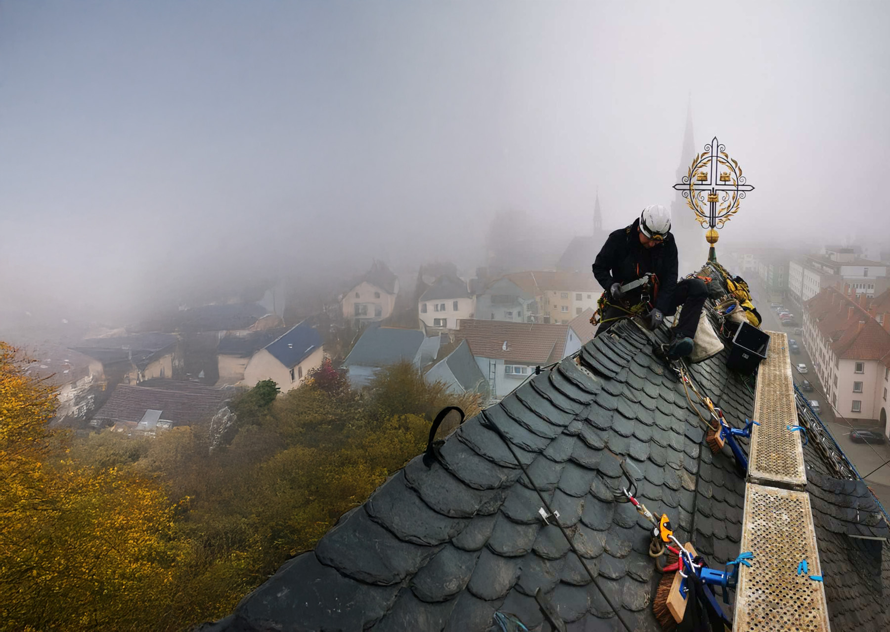 Von Schiefer über Kupfer bis hin zu Bleidächern: Wir bieten seilgestützte Sanierungen, die historische Substanz bewahren. Dank unserer Erfahrung und Versicherungspartnern sind wir flexibel in ganz Deutschland im Einsatz
