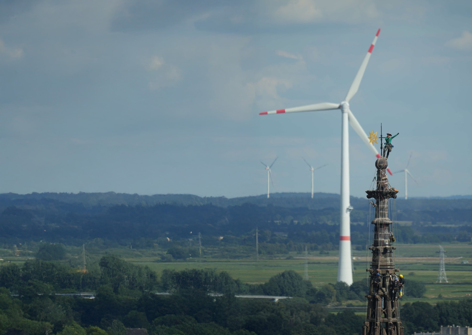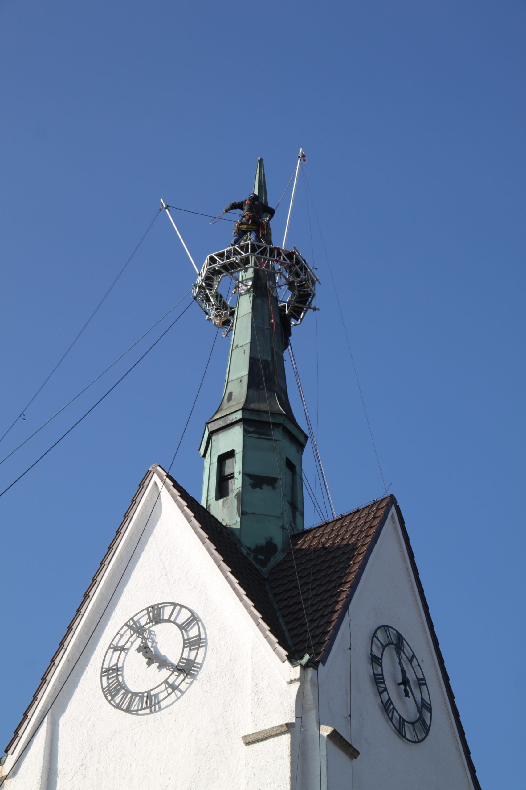 Historische Turmspitzen bergen und sanieren wir mit unserer patentierten TSP‑Methode. Diese seilgestützte Technik ermöglicht sichere, denkmalgerechte Arbeiten – effizient, kostenschonend und ohne Vollgerüst.
